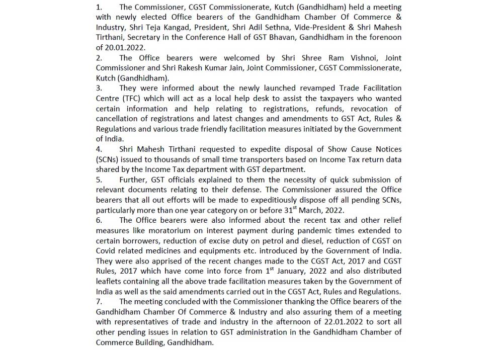 Meeting of the Commissioner, CGST Commissionerate, Kutch (Gandhidham) with the Office bearers of the Gandhidham Chamber of Commerce & Industry