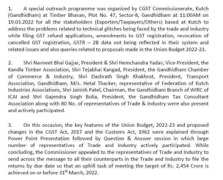 An interactive session in co-ordination with the Kandla Timber Association, Gandhidham, to share the highlights of the Union Budget, 2022 and proposed changes in the Central GST Act, 2017 and the Customs Act, 1962, on 02.02.2022 at the Timber Bhavan, Ganohidham
