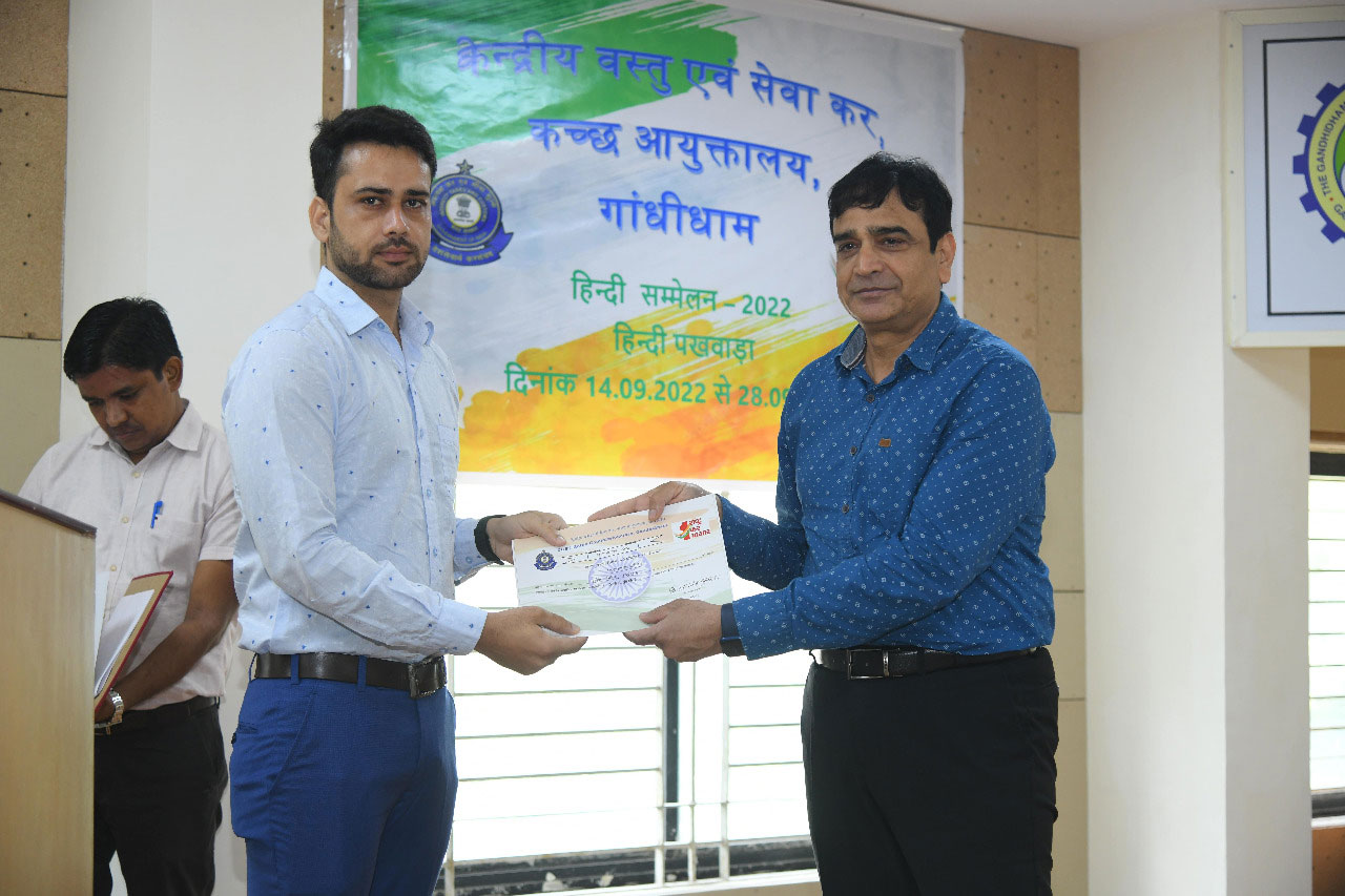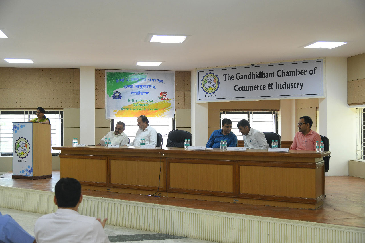 हिन्दी दिवस के सुअवसर पर केंद्रीय वस्तु एवं सेवा कर, कच्छ आयुक्तालय गांधीधाम द्वारा हिन्दी राजभाषा समेलन का आयोजन दिनांक 26 सितम्बर 2022 को पूर्वाह्न 11:30 बजे को चेंबर्स ऑफ कॉमर्स, गांधीधाम में किया गया I