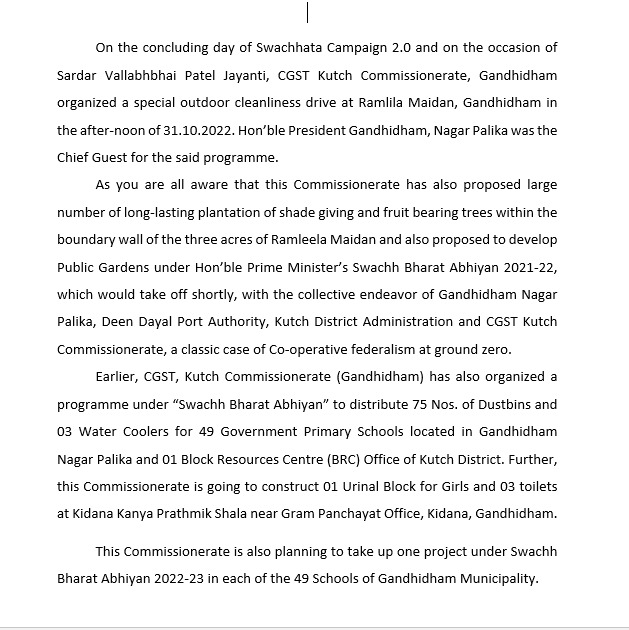 On 31st October, 2022, as a part of Swachhata Campaign 2.0, a special outdoor cleanliness drive was conducted in 3 acres of Ramleela Maidan, Gandhidham, in which 70 No. of Officers and Staff participated and cleaned up garbage was collected in 80 environmentally bags for disposal.