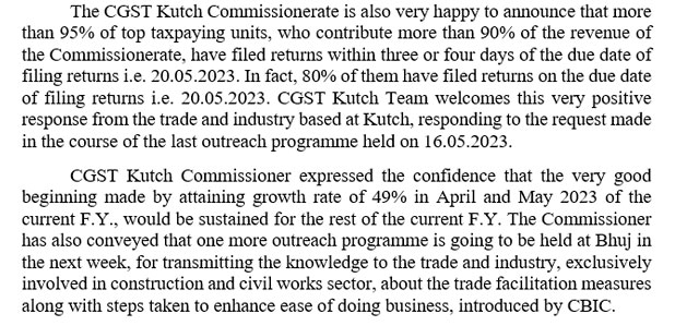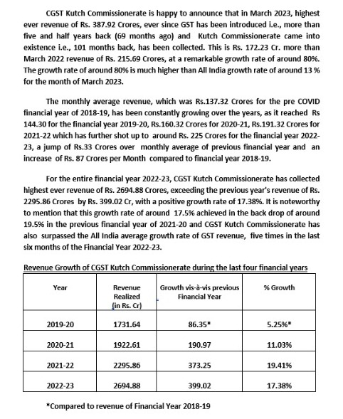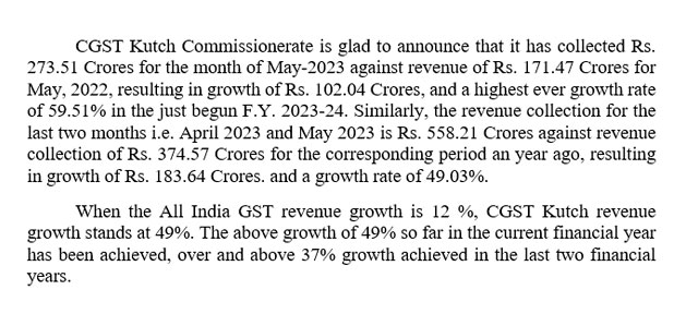 CGST Kutch Commissionerate is glad to announce that it has collected Rs. 273.51 Crores for the month of May-2023 against revenue of Rs. 171.47 Crores for May, 2022, resulting in growth of Rs. 102.04 Crores, and a highest ever growth rate of 59.51% in the just begun F.Y. 2023-24.